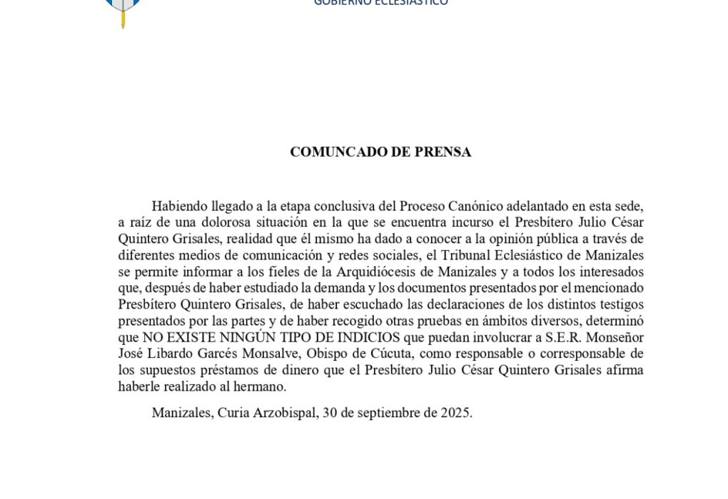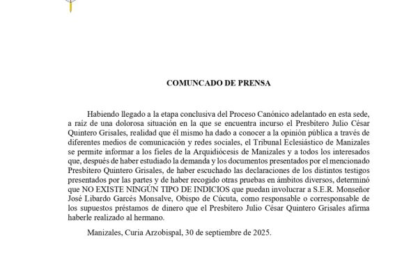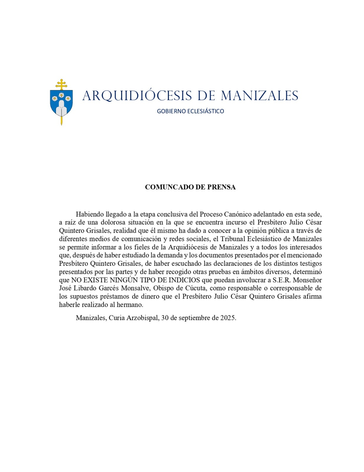 Nota clarificatoria ante los medios de comunicación por versión del Padre Julio César Quintero Grisales, sobre una supuesta deuda con mi hermano El Padre Julio César Quintero Grisales, Sacerdote de la Arquidiócesis de Manizales, ha difundido en los medios de comunicación una información sobre una supuesta deuda que mi hermano tiene con él, manifestando su…