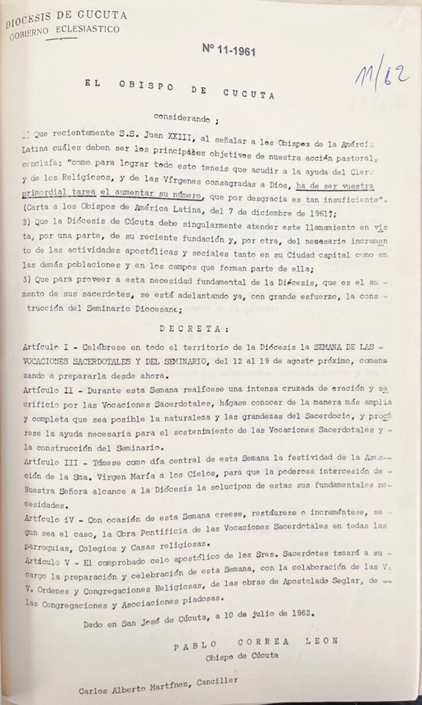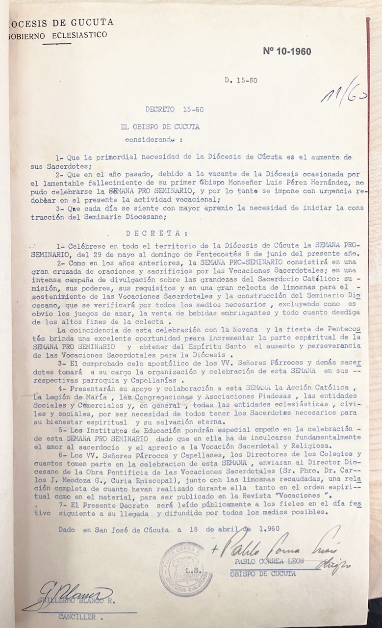 El decreto diocesano de 1960 de Monseñor Pablo Correa León, como segundo obispo de Cúcuta, sobre la “Semana Proseminario” confirma su rol activo en la promoción de voca­ciones apenas un año después de su nombramiento el 22 julio 1959 y de su posesión 11 noviembre 1959; con­tinuando el legado de Monseñor Luis Pérez Hernández. Sale a la vista que el decreto invita a una “SEMANA PRO-SEMINARIO como en los años anteriores”; lo que nos deduce que ya al menos dos o tres años atrás se venía realizando esta actividad diocesana. A continuación, les proporciono algunos de los apartados del decreto, siendo fuente de primera mano seguro que la apreciarán: