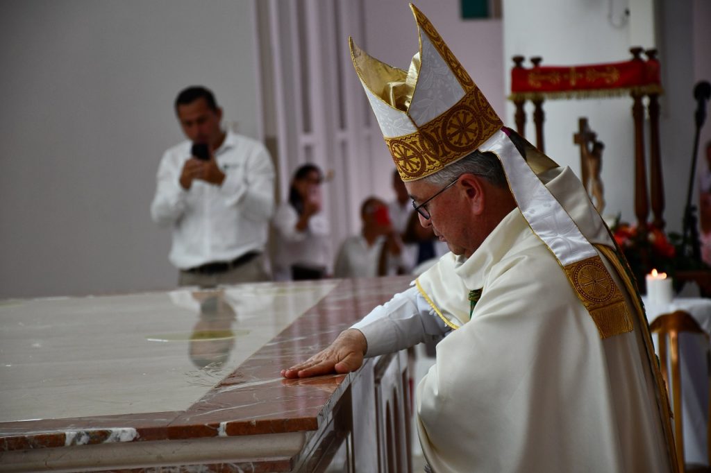 Durante la homilía monseñor José Libardo Garcés Monsalve, obispo de la Diócesis de Cúcuta, manifestó: “hoy ha entrado Jesucristo Crucificado a este templo como el cimiento sobre el cual se ha realizado esta construcción. El cimiento sobre el que se construye nuestra vida cristiana y espiritual. Todos nosotros tenemos nuestra vida centrada en Cristo. Y por eso edificamos la Iglesia, el templo material, primero sobre la roca firme, Nuestro Señor Jesucristo. Y nos reunimos al comienzo de esta visita pastoral en este lugar para la Dedicación de este templo, la Consagración del Altar, bendiciendo cada uno de los lugares que serán dedicados a la Eucaristía, a la oración y a la vida sacramental”.