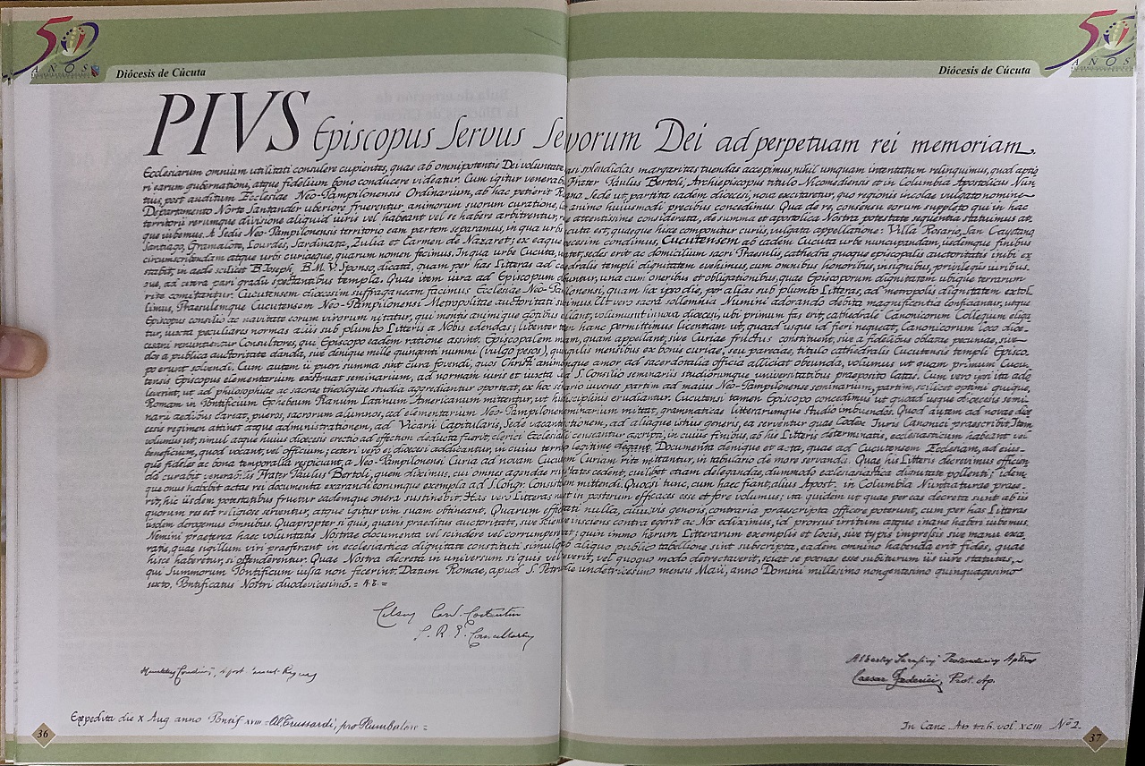 Quise iniciar en la edición anterior mostrándoles la bula pontificia del Papa Pío XII, llamada Ecclesiarum Omnium, con fecha del 2 de mayo de 1956, a partir de la cual se desprendía la mayor parte del territorio de lo que hoy es la Diócesis. La lectura de este documento nos da una visión no contada por otros, sino por las mismas fuentes primarias, permitiéndonos un acercamiento a la historia, desde una perspectiva muchas veces desconocida. A partir de este momento, a ninguno de ustedes les queda permitido olvidar el documento, como tampoco olvidar que este está guardado en la curia diocesana y, que fue el Papa Pío XII el que quiso elevar nuestra ciudad al status de Diócesis de Cúcuta.